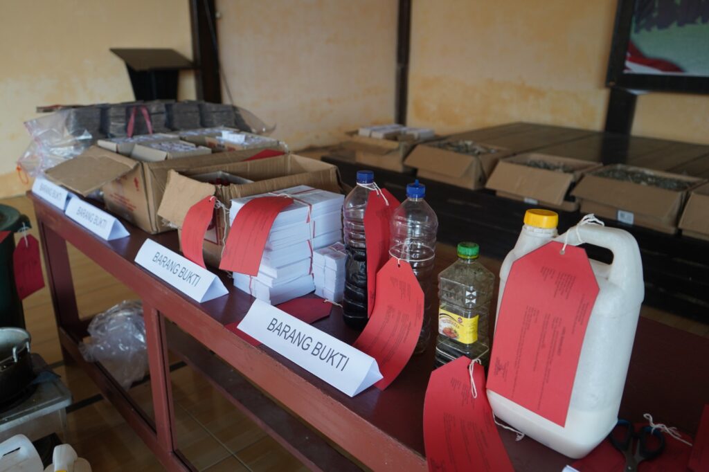 Dari hasil penggeledahan, petugas menyita ribuan barang bukti berupa botol kosong, tutup botol, kertas pembungkus, label, hologram, bahan campuran, serta ratusan botol berisi minyak gosok palsu berbagai ukuran. Di antaranya, 900 botol kaca kosong ukuran DD, 246 botol berisi minyak Tawon ukuran DD, 94 botol ukuran CC, 144 botol ukuran EE, 337 botol ukuran FF, serta ribuan perlengkapan produksi lainnya. Barang bukti juga ditemukan di Toko wilayah sentani dengan total 192 botol minyak gosok siap edar.