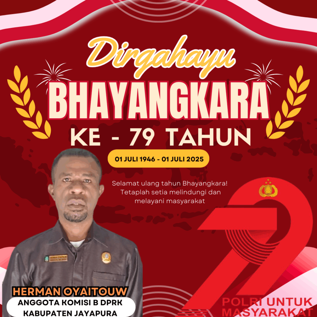 Suara Tabi – Anggota Komisi B DPRK Kabupaten Jayapura Herman Oyaitouw mengucapkan selamat hari ulang tahun bhayangkara ke – 79 tahun, dengan usia ini Polri tetap hadir di garda terdepan untuk melindungi dan melayani rakyat.