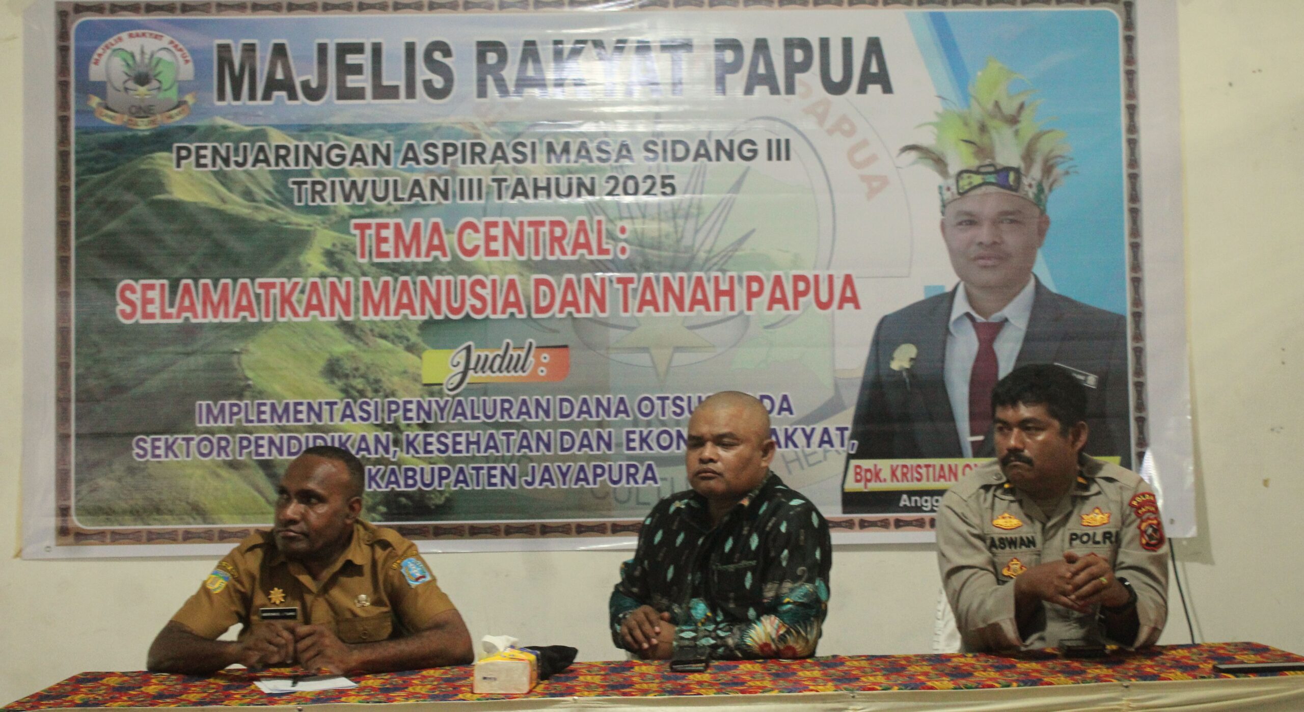 Dalam penyampaiannya Christian Ondikeleuw, Ia mengatakan, untuk penjaringan aspirasi di triwulan ke – III tahun 2025 ini masih tetap dengan tema besar ” Selamatkan Manusia dan Tanah Papua “, yang mana dalam implementasinya dana Otsus harus benar-benar berpihak atau dirasakan oleh Orang Asli Papua ( OAP ).