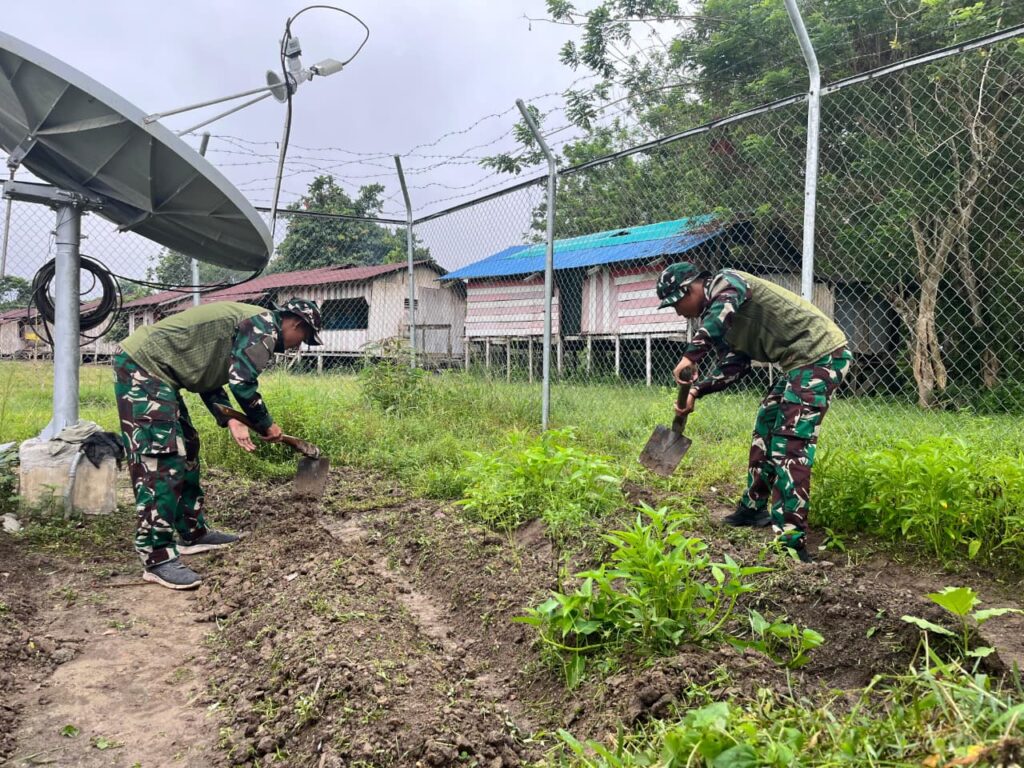Melihat lahan kosong yang tersedia di sekitaran Pos membuat personel Satgas berinisiatif memanfaatkan lahan kosong di sekitaran Pos untuk di tanami sayur-sayuran untuk mencukupi kebutuhan sehari-hari personel satgas.