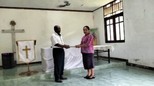Mewakili BPK Klasis Tanah Merah dan seluruh jemaat GKI, Wakil Ketua Klasis Pnt. Irenius Demena menyerahkan peta berisi hasil penilaian tersebut kepada pihak kampus.
