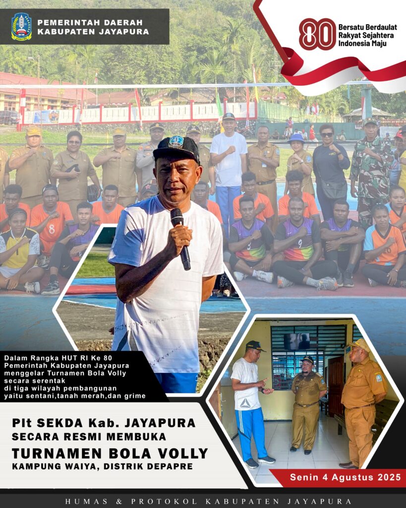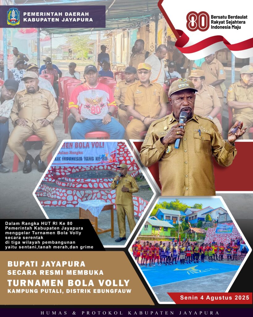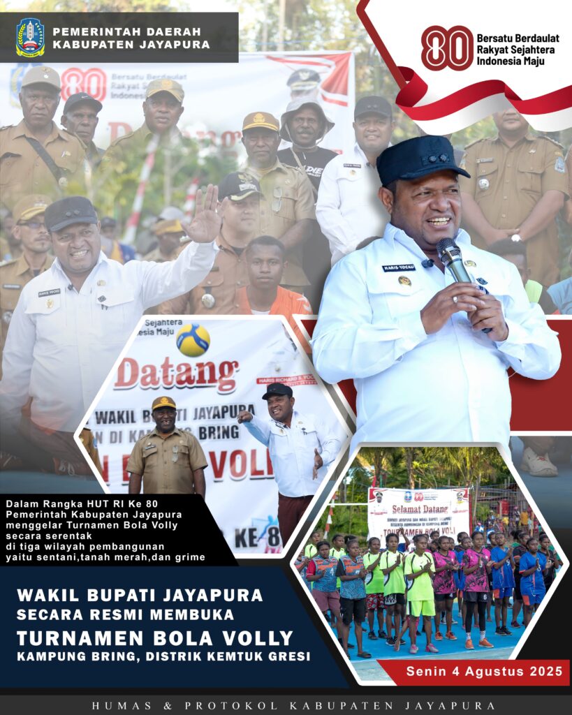 Suara Tabi – Pemerintah Kabupaten ( Pemkab ) Jayapura dalam menyambut HUT RI ke – 80 menggelar Turnamen Bola Voli di tiga zona wilayah Kabupaten Jayapura, giat tersebut berlangsung pada Senin, 4 Agustus 2025, dibuka oleh Pimpinan Kepala Daerah Kabupaten Jayapura.